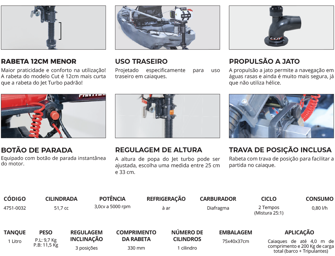 MAIS CURTO, MAIS PRÁTICO – O tamanho da rabeta do Jet Turbo Cut é reduzido para uma maior praticidade e conforto na utilização do motor em seu caiaque. sua rabeta é 12CM MAIS CURTA que a rabeta do jet turbo padrão!